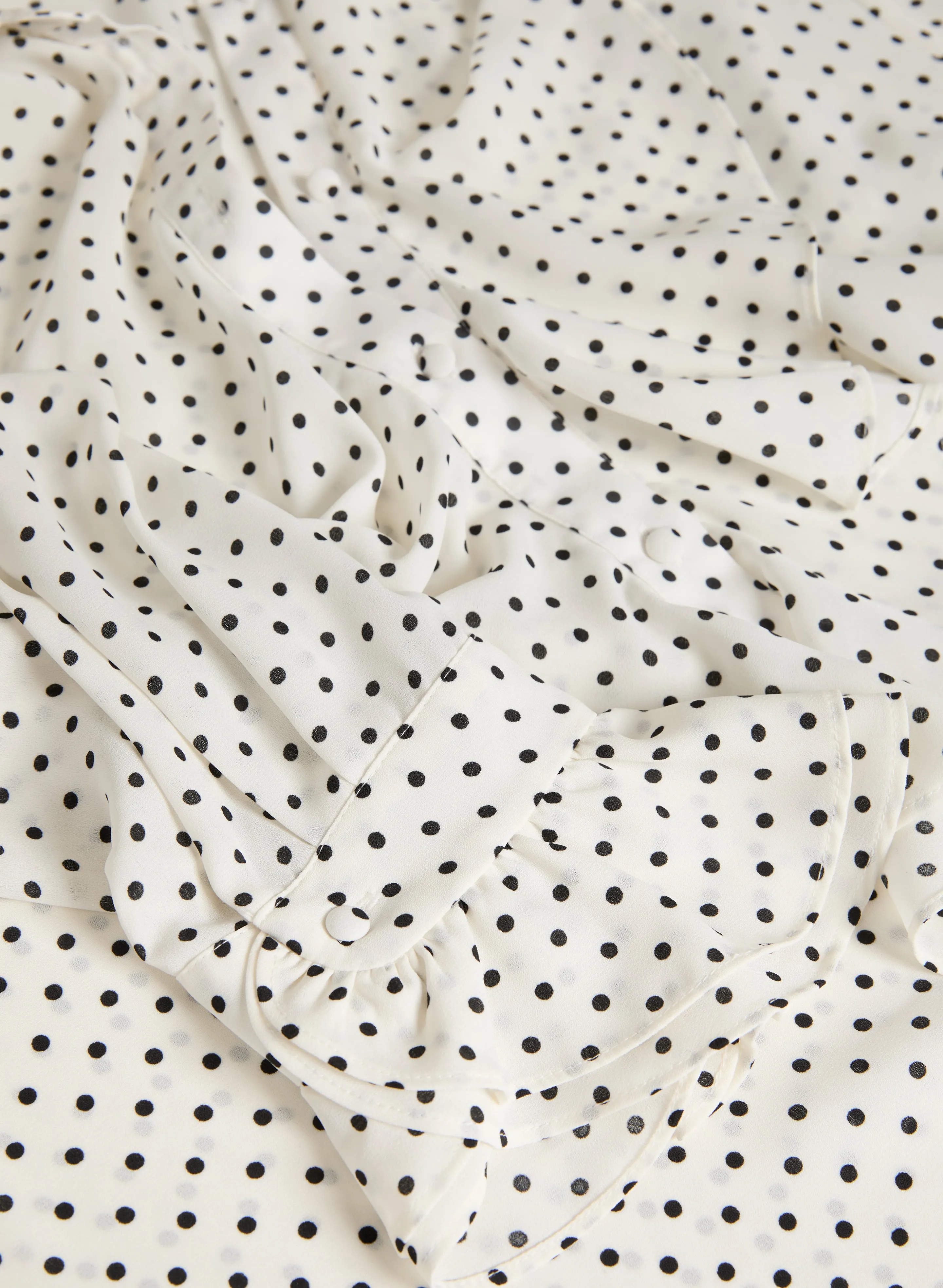 Feel the comfort of our polka dot ruffle front blouse. The details of our top will go with any structured pants in your wardrobe.